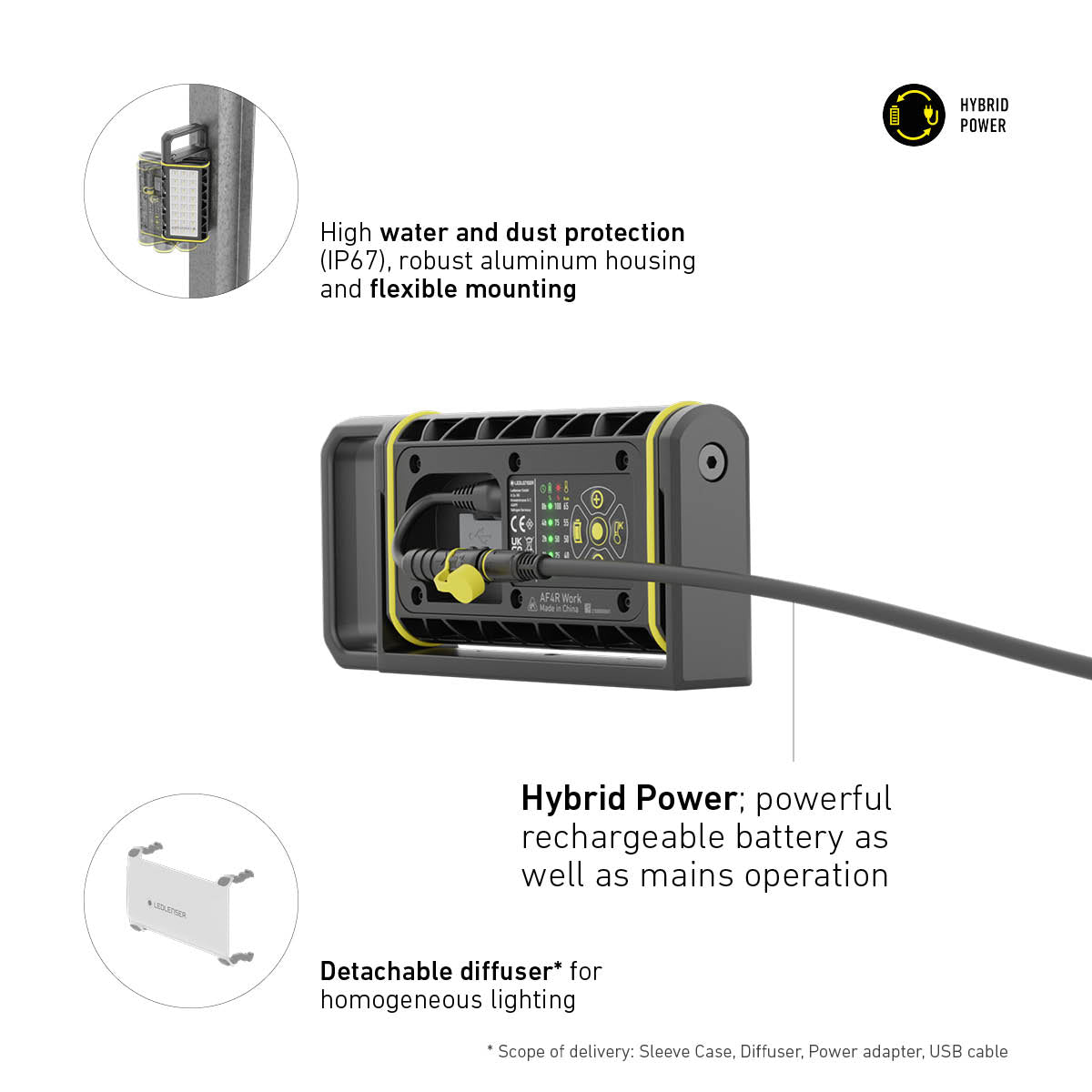Designed for real‑world use, the AF4R offers Hybrid Power, allowing operation from its built‑in rechargeable battery or via AC mains power. Enjoy up to 20 hours of runtime on low mode or keep it plugged in for continuous illumination on long, demanding jobs. The unit is housed in robust aluminium construction and rated IP67, ensuring exceptional resistance to dust, water, and harsh working conditions—perfect for both indoor and outdoor applications.