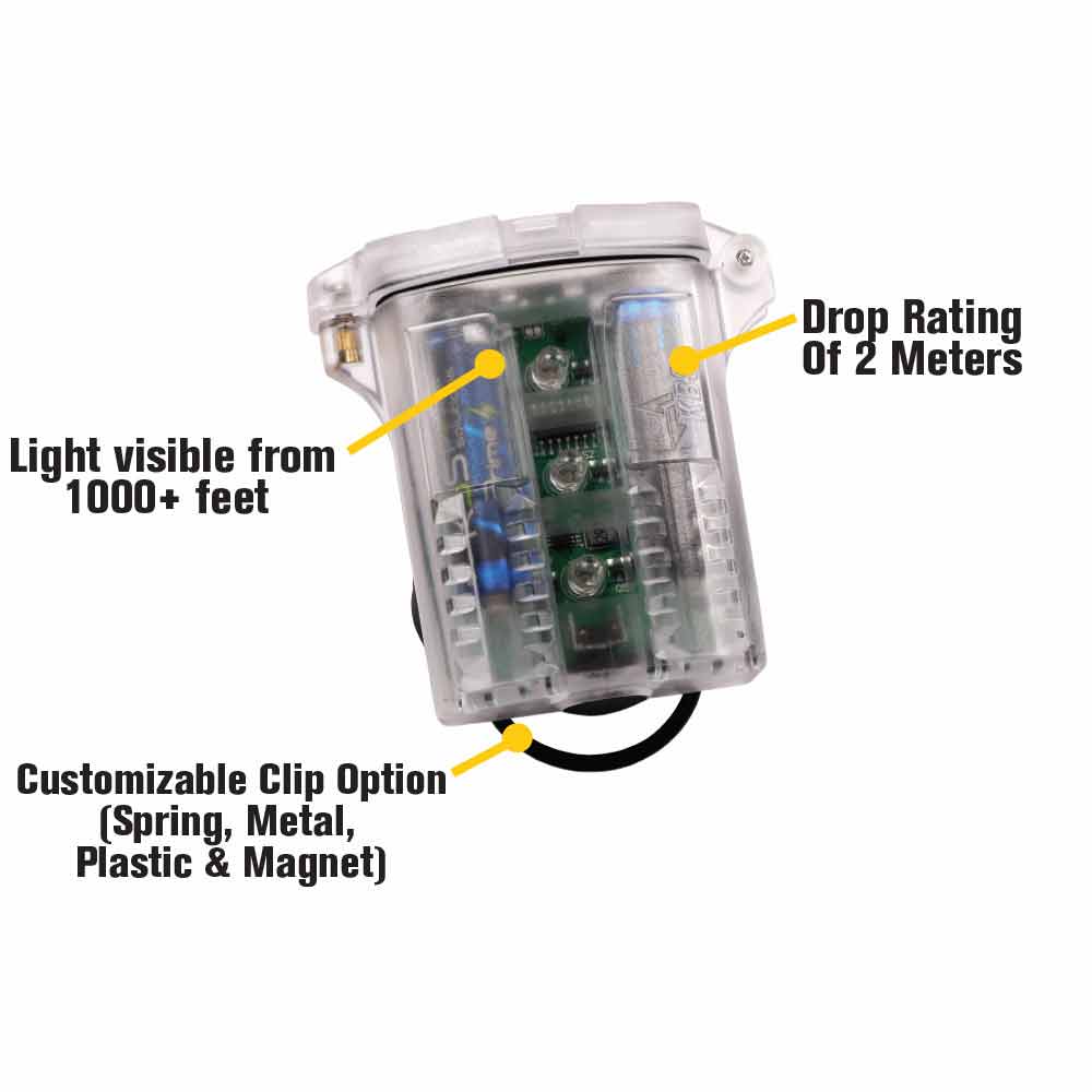 The beacon is available in five bold LED colours—Red, Blue, Amber, White, and Green—to support color‑coded team identification and safety zoning. Multiple mounting options are available, including metal clips, plastic clips, spring clips, magnet mounts, and optional helmet bands, making it easy to attach to hard hats, harnesses, jackets, packs, or machinery. Each unit includes 3M Dual Lock for secure placement on gear or equipment.