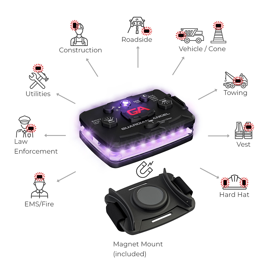 One of the most versatile features is the patented Magnet Mounting System, which allows instant mounting to any Guardian Angel accessory. With a built‑in rare‑earth magnet capable of withstanding 22 lbs of pull force, the device snaps securely into place and stays put in high‑movement or high‑vibration situations. It can also be hard‑mounted using included screws for permanent setups. The included base mount with Velcro strap adds even more flexibility for placement on clothing or gear.
