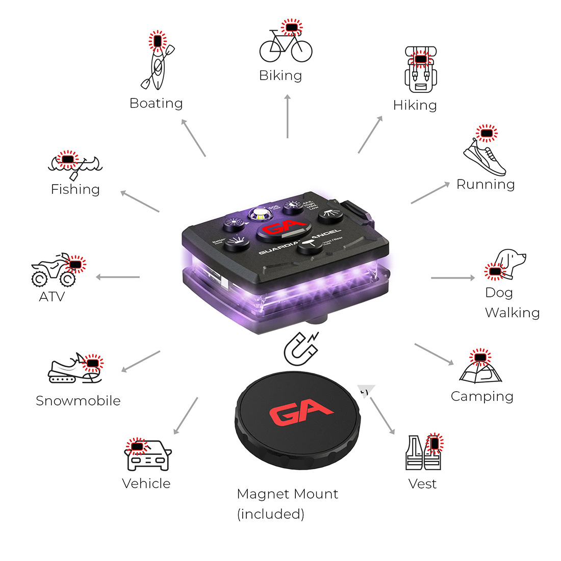A rare‑earth magnetic mounting system comes built into every unit, providing a fast, secure way to attach the light to clothing, gear or any compatible metal surface. This magnet holds up to substantial pressure and works with all Guardian Angel mounting accessories, ensuring stable placement during movement. The included base mount also features an option for tethering to add extra security when operating in demanding conditions.